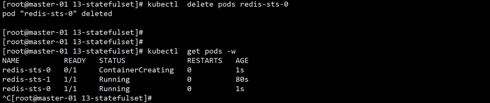 #由于 StatefulSet 和 Deployment 一样会监控 Pod 的实例,发现 Pod 数量少了就会很快创建出新的 Pod,并且名字、网络标识也都会和之前的 Pod 一模一样: