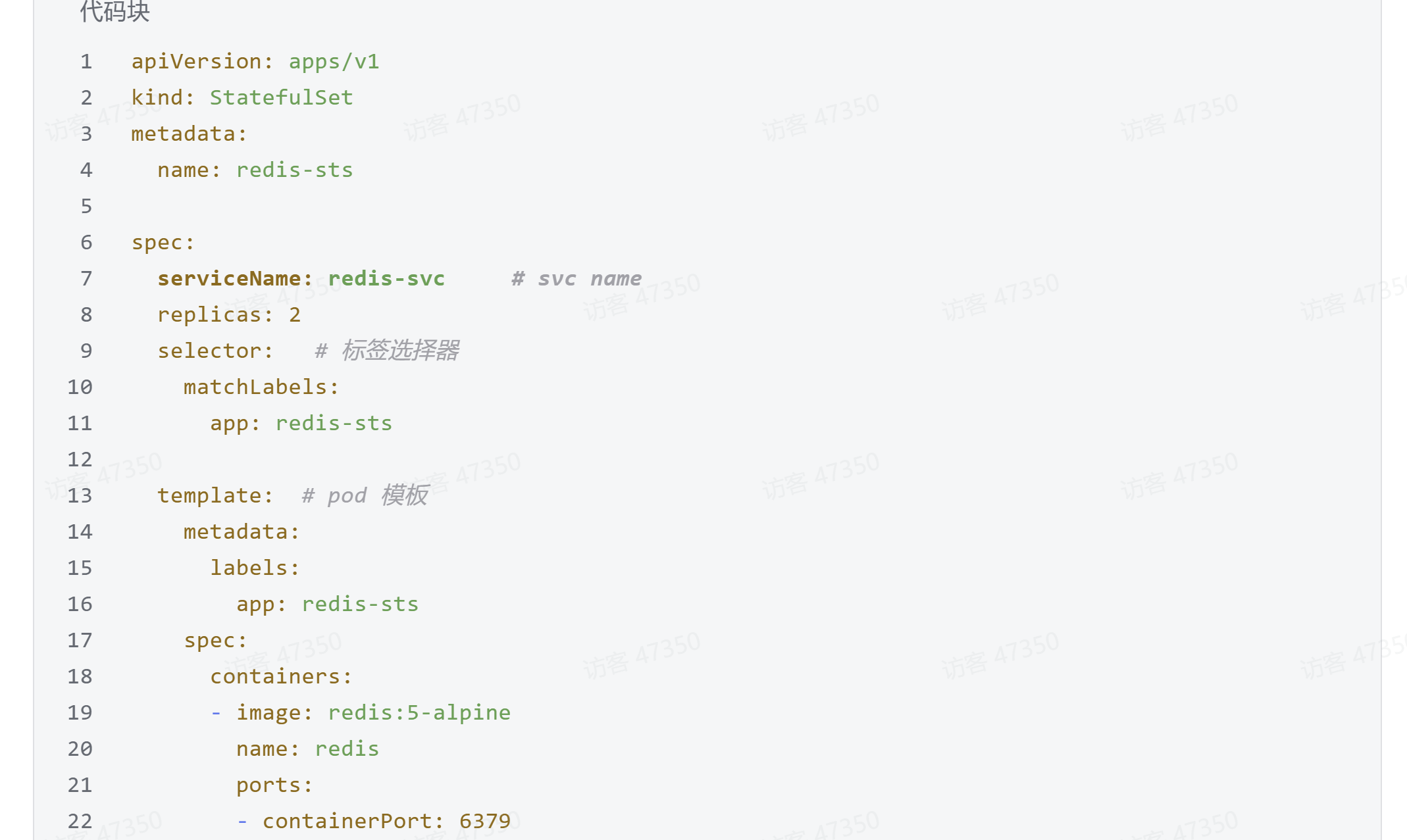 #首先 StatefulSet 对象的名字是 redis-pv-sts,表示它使用了 PV 存储。然后“volumeClaimTemplates”里定义了一个 PVC,名字是 redis-100m-pvc,申请了 100MB 的 NFS 存储。在 Pod 模板里用 volumeMounts 引用了这个 PVC,把网盘挂载到了 /data 目录,也就是 Redis 的数据目录
