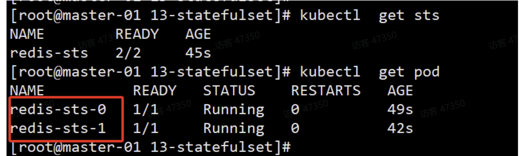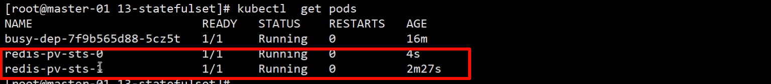 #可以看出StatefulSet 所管理的 Pod 不再是随机的名字了,而是有了顺序编号,从 0 开始分别被命名为 redis-sts-0、redis-sts-1,Kubernetes 也会按照这个顺序依次创建(0 号比 1 号的 AGE 要长一点),这就解决了“有状态应用”的第一个问题:启动顺序